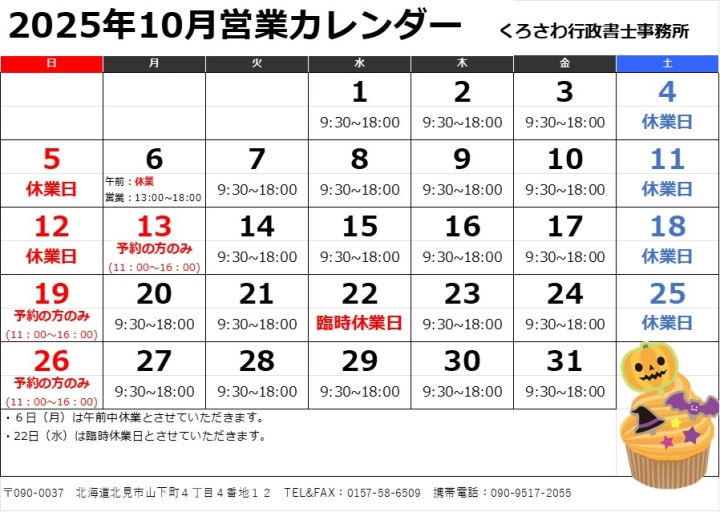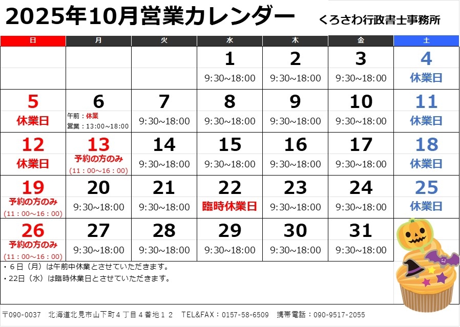 10月の営業カレンダー(くろさわ行政書士事務所) 2025年10月の営業カレンダーです。(9月28日現在)「休業日」の日も場合によっては対応可能ですので、お問合せくださいカレンダー画像をクリックしていただくと拡大できます※6月より営業時間が平日9:30~18:00に拡大しました。(日曜は従来通り事前予約のお客様のみの対応となります) カレンダーをクリックすると拡大されます